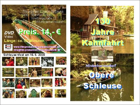 Die 60-minütige DVD enthält alle Höhepunkte des Jubiläumsfestes der Kahnfahrt an der Oberen Schleuse, informiert darüber hinaus über die historische Entwicklung , würdigt die Arbeit der Bewahrer des Kleinodes der Hinteren Sächsischen Schweiz